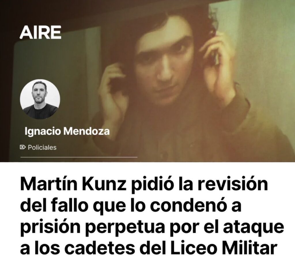 El excadete del Liceo Militar de Santa Fe, Martín Kunz, apeló el fallo que lo condenó a pena de prisión perpetua por el homicidio de un chofer de una combi y el posterior ataque a siete liceístas en el marco de un viaje a San Javier