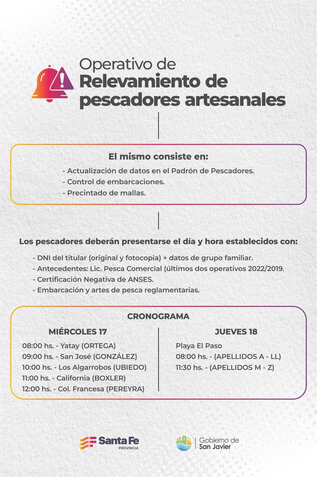 La Dirección General de Manejo Sustentable de los Recursos Pesqueros de la Provincia de Santa Fe llevara adelante un Operativo de Relevamiento de Pescadores Artesanales que incluye: